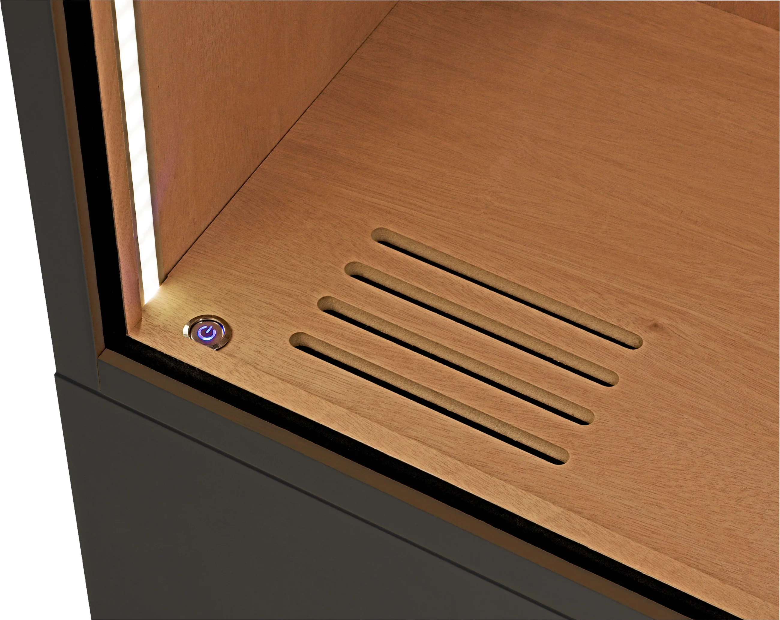 - Perfekt mikroprocessorstyrd befuktning och idealisk cirkulation garanteras av den dubbla bakväggen. Luftfuktigheten fördelas jämnt över humidorens olika nivåer.