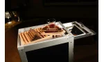 Ytan är klädd i svart träfanér vars djupa, mörka lyster kontrasterar elegant mot det silverfärgade aluminiumhöljet. Varje vagn är ett unikt, handgjort exemplar - ett statement för cigarrälskare med höga krav på estetik och kvalitet.