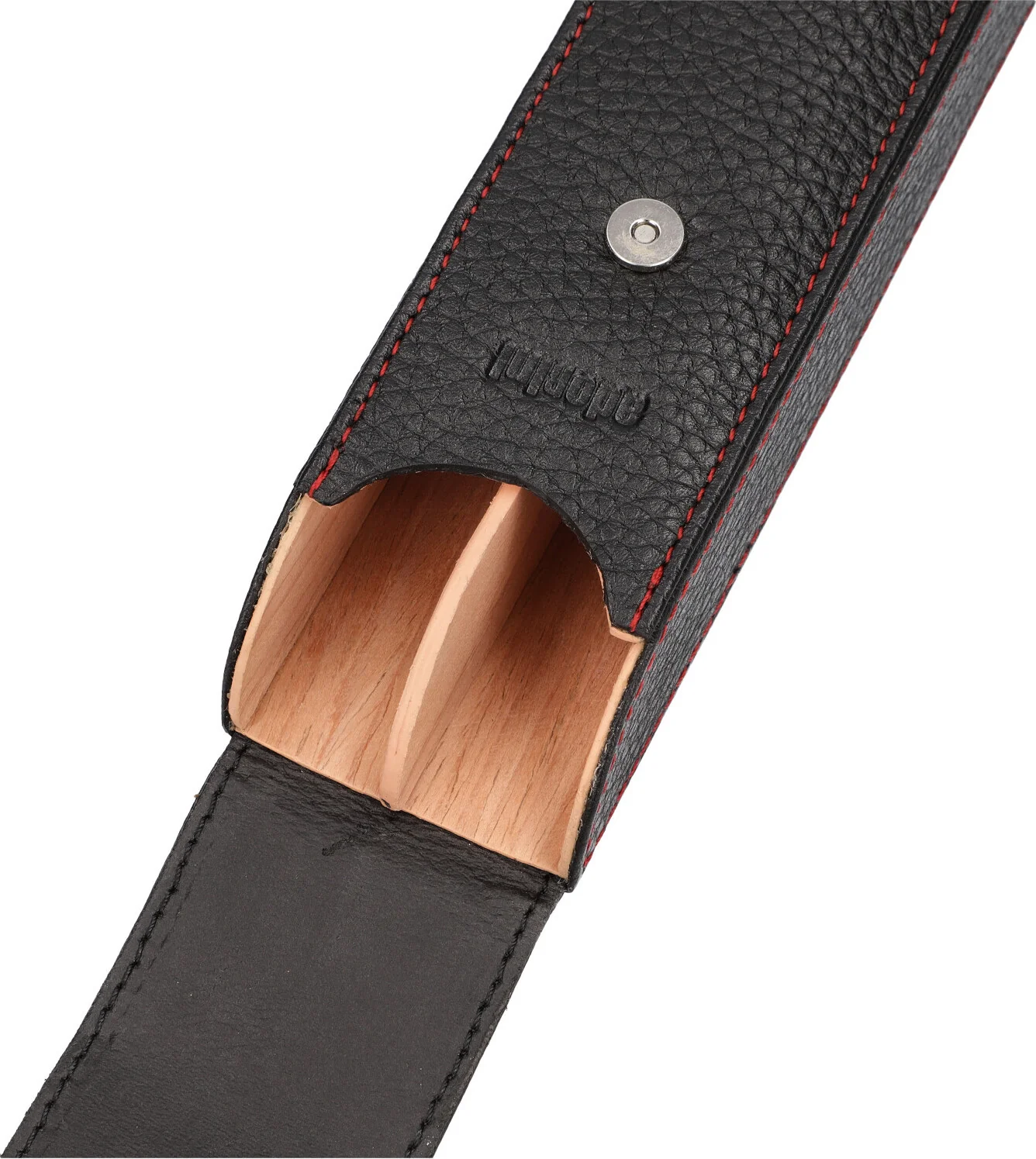 Fodralet rymmer två cigarrer med en maximal längd på 16 cm. En praktisk magnetisk snäppstängning garanterar ett säkert grepp och ger fodralet ett sofistikerat utseende. En subtil adorini-prägel finns under öppningsläppen, medan den röda dekorativa sömmen skapar en elegant kontrast och harmoniskt avrundar utseendet.