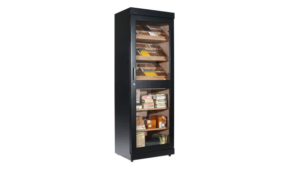 Med en tillräcklig kapacitet för att hantera upp till 3100 cigarrer i coronastorlek, erbjuder Roma Electronic humidor-skåpet en vacker moduldesign som är idealisk för kommersiellt bruk eller för de begränsade områden där du ändå behöver stor cigarrförvaring. Denna solida svartlackade favorit har tjocka väggar för större effektivitet i både energiförbrukning och luftfuktighetskontroll. Den extra stabiliteten hos dessa väggar rymmer en kraftig glaspanelsdörr med ett förkromat handtag och lås, som skyddar ett inre foder av ångat spanskt cederträ. Fem flyttbara spanska cederbrickor samarbetar med justerbara hyllplan för att erbjuda all flexibilitet som behövs för att lagra och visa dina cigarrer, vare sig de visas individuellt eller i hela lådor.