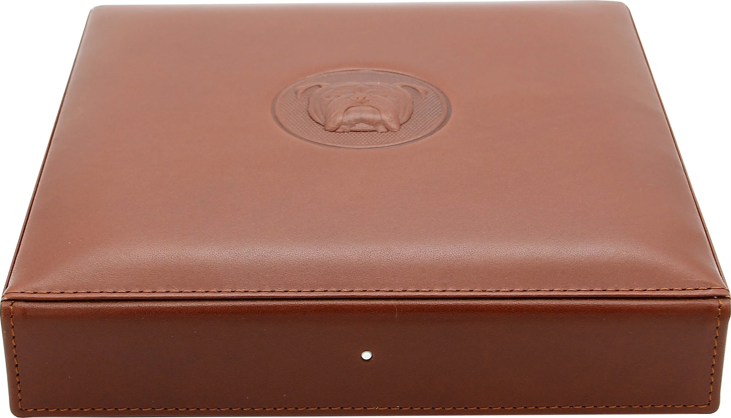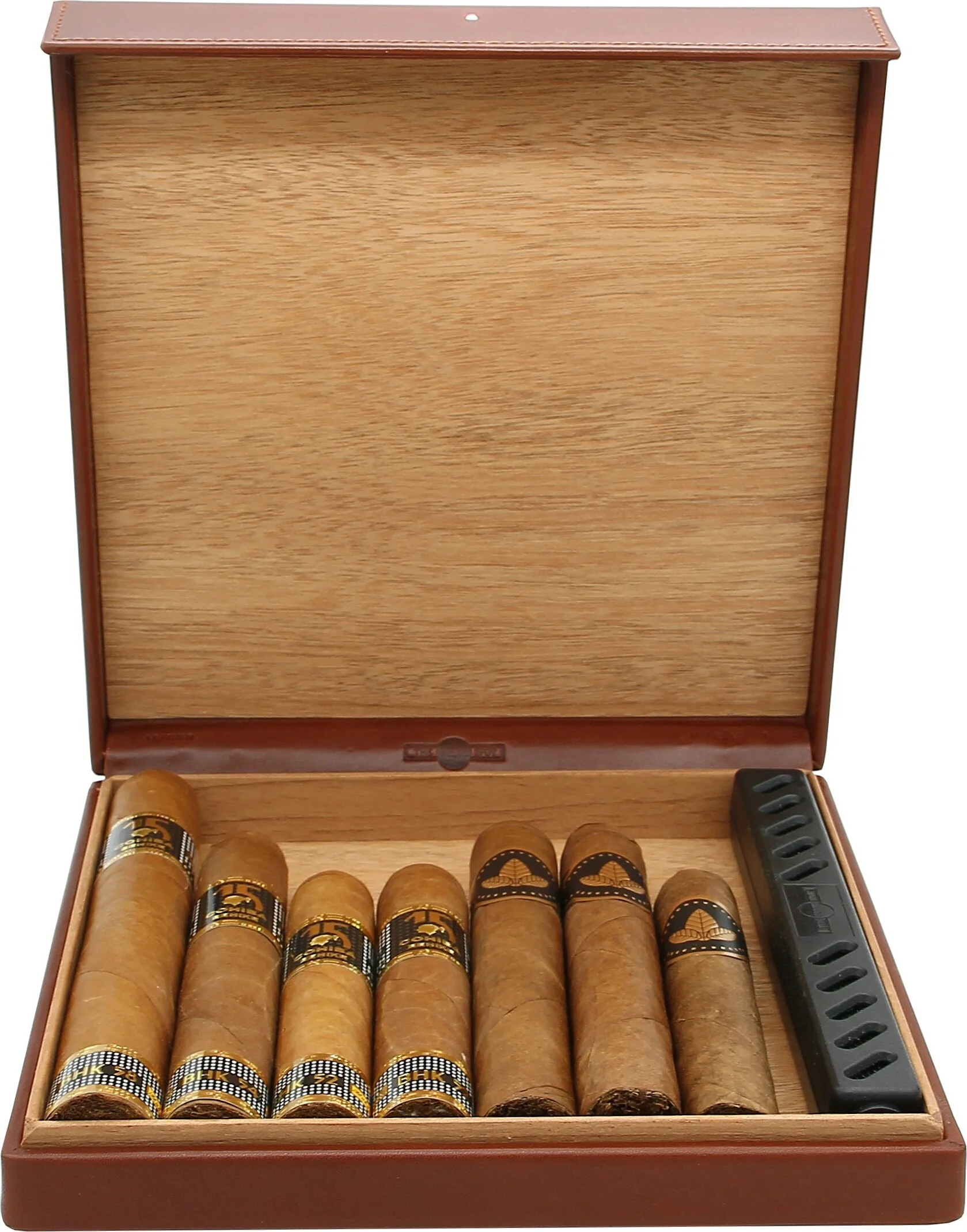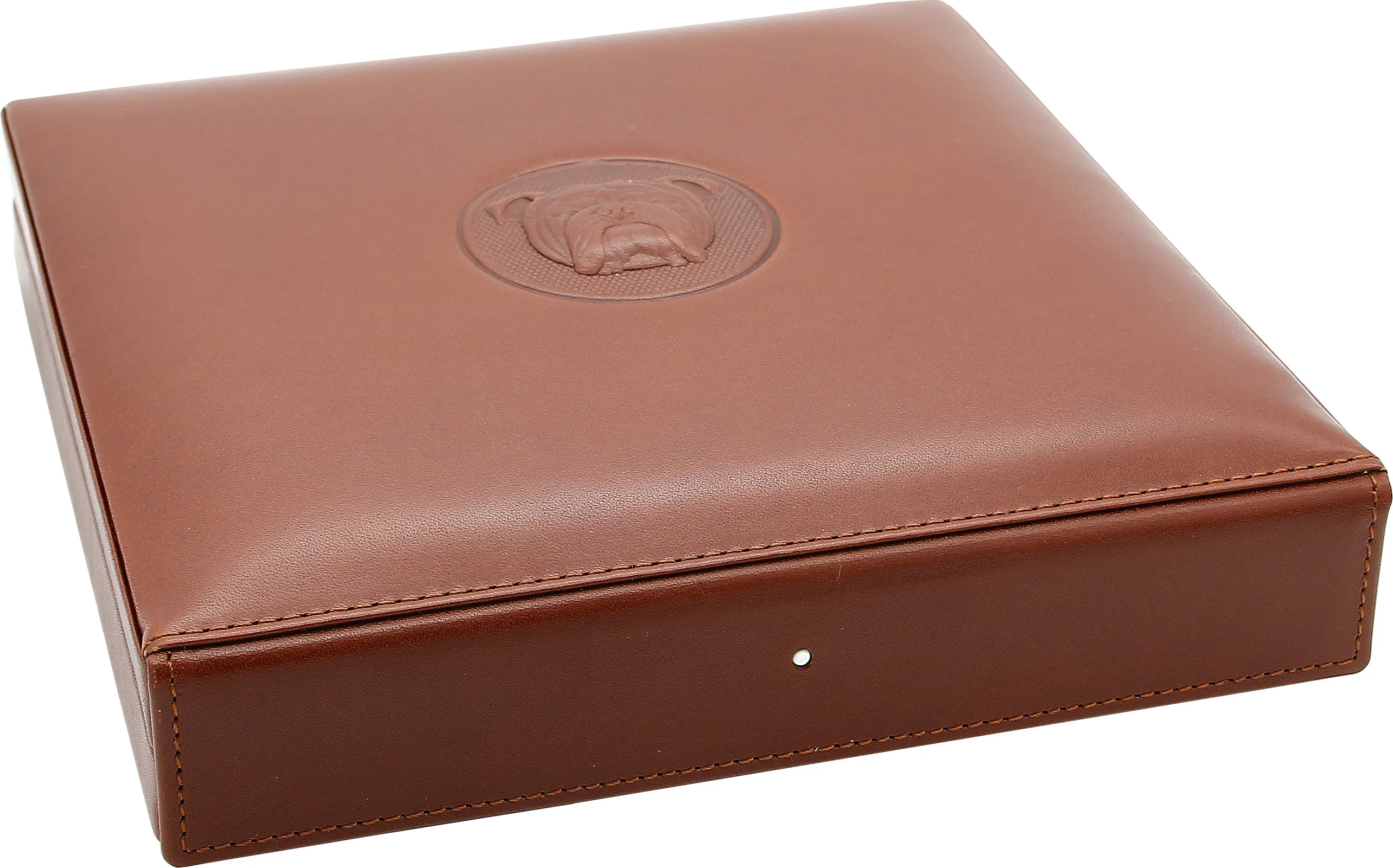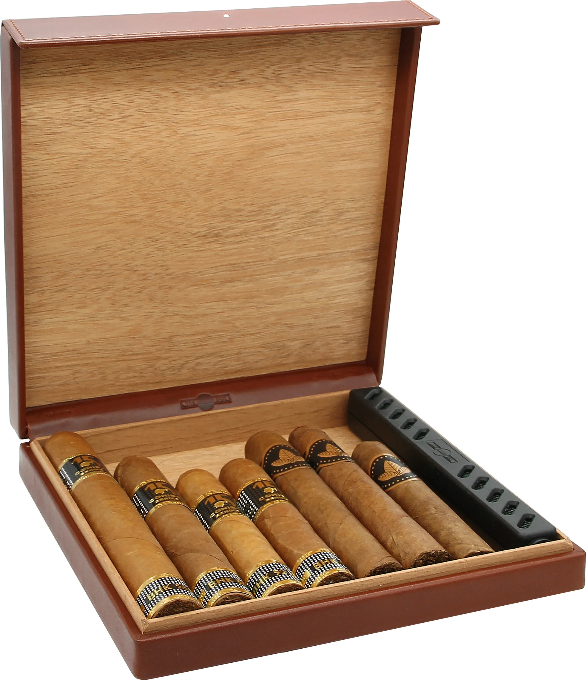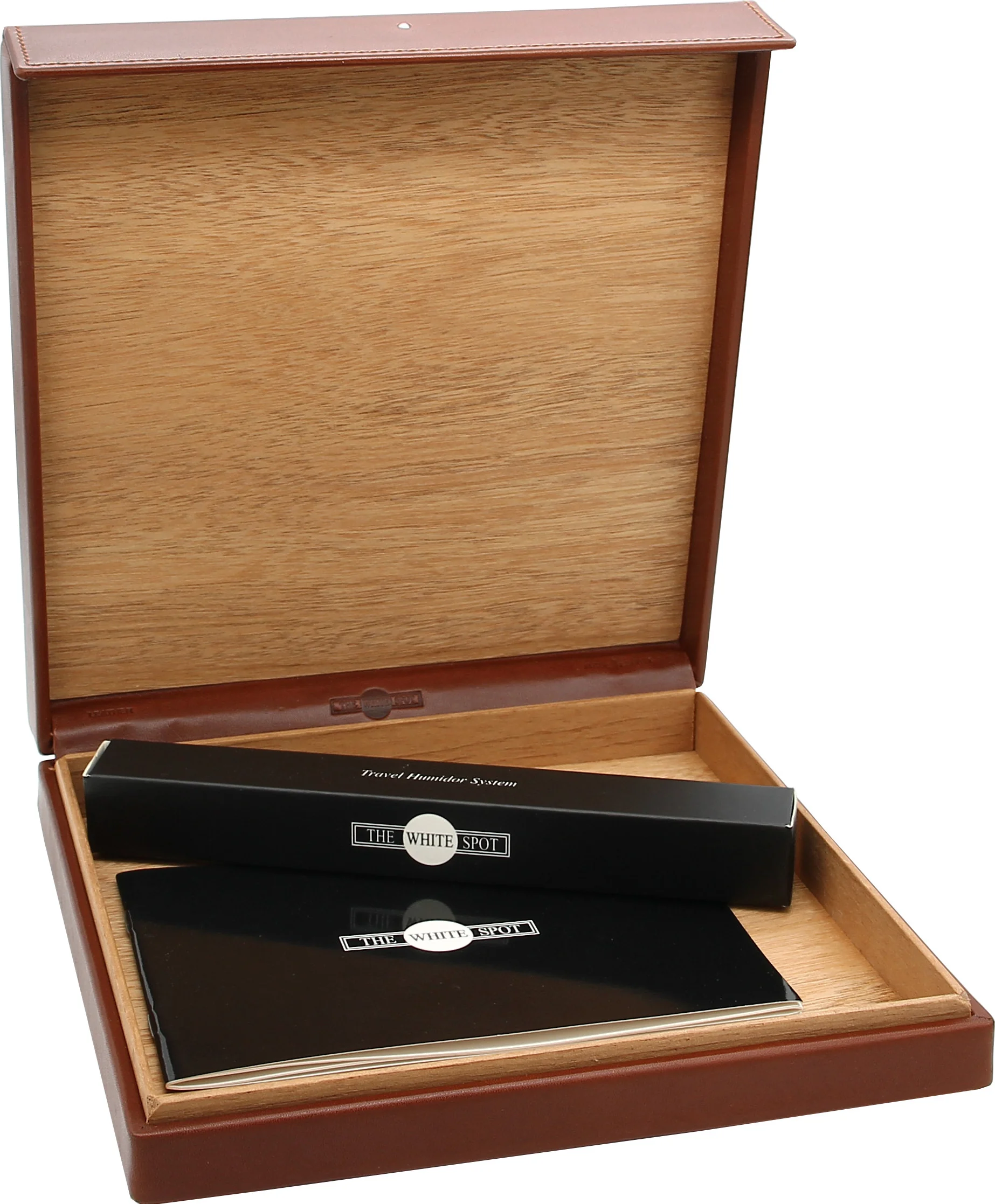 Denna eleganta bruna resehumidor från det välkända engelska varumärket Dunhill är den perfekta följeslagaren på resan. Den är klädd i det finaste spanska lädret och fodrad med högkvalitativt trä och erbjuder utrymme och skydd för ca 10 cigarrer. Stängningen är ett magnetiskt spänne som är dolt under lädret. Bulldogglogotypen som är präglad i lädret är ett omisskännligt Dunhill-varumärke, liksom den berömda vita fläcken på humidorens framsida. En sofistikerad resehumidor som på ett elegant sätt skyddar dina cigarrer och visar sig vara en pålitlig följeslagare på alla dina resor och utflykter.