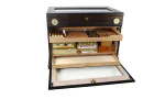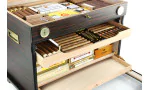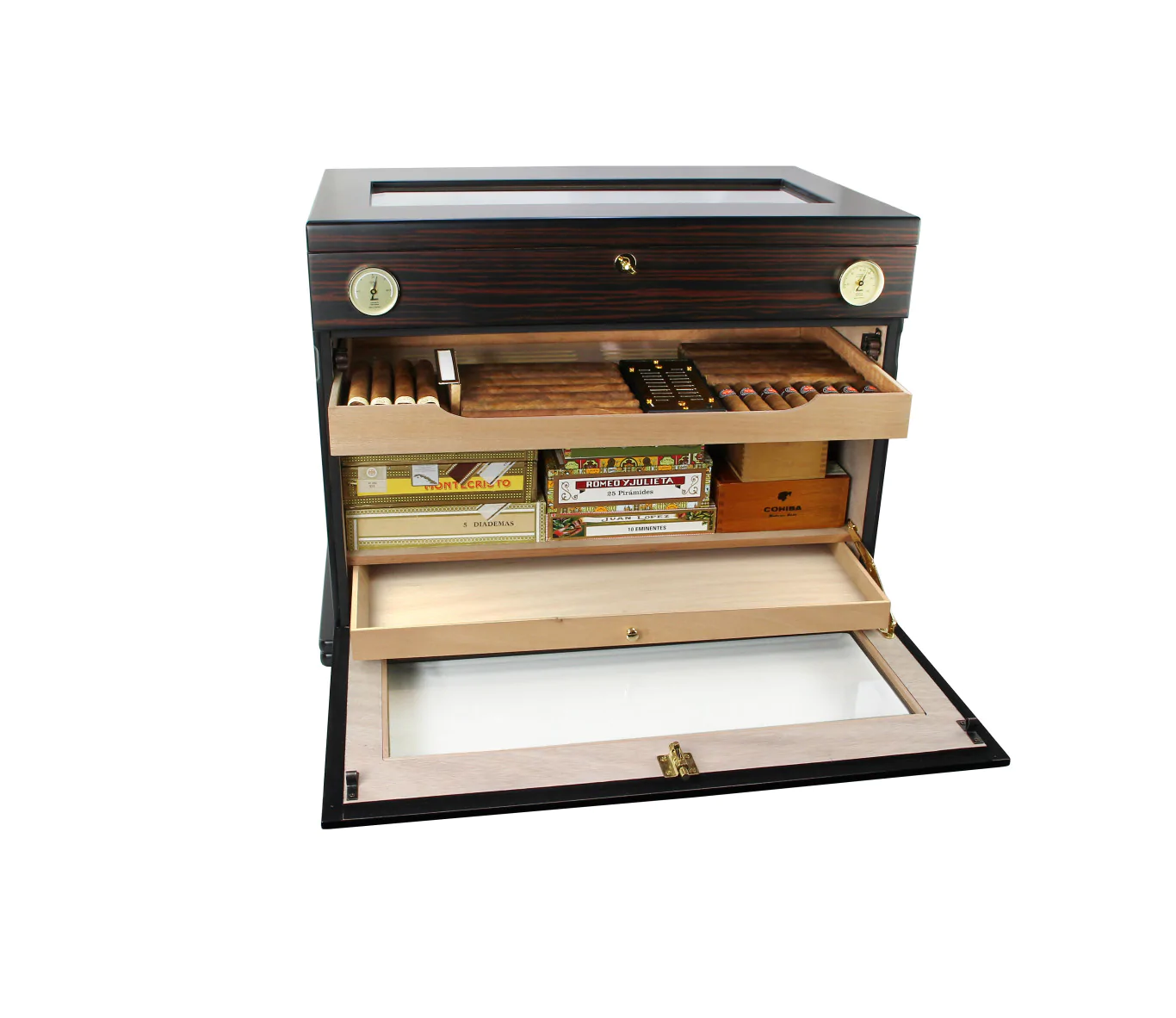 En vacker flerfärgad ebenholtsexteriör kompletteras med ett mässingslås och ett par handtag för bekvämlighet. En integrerad mässingstermometer ansluter sig till en hårhygrometer med hög precisionen på frontpanelen, för ökad elegans och enkel kontroll av humidorens klimat. Separata öppningar avslöjar ett brett utbud av lagringsutrymmen för upp till 400 cigarrer i coronastorlek. Det övre facket har en glaspanel i locket och en innovativ spanskt cederbricka med adorinis AirVent-design för förbättrad cirkulation. Den främre delen av humidoren, som även den är utrustad med en glaspanel fälls ner för att ge åtkomst till ett andra AirVent-fack, lagringsområde och tillbehörslåda.