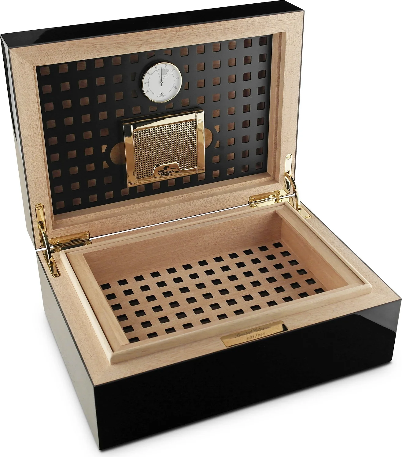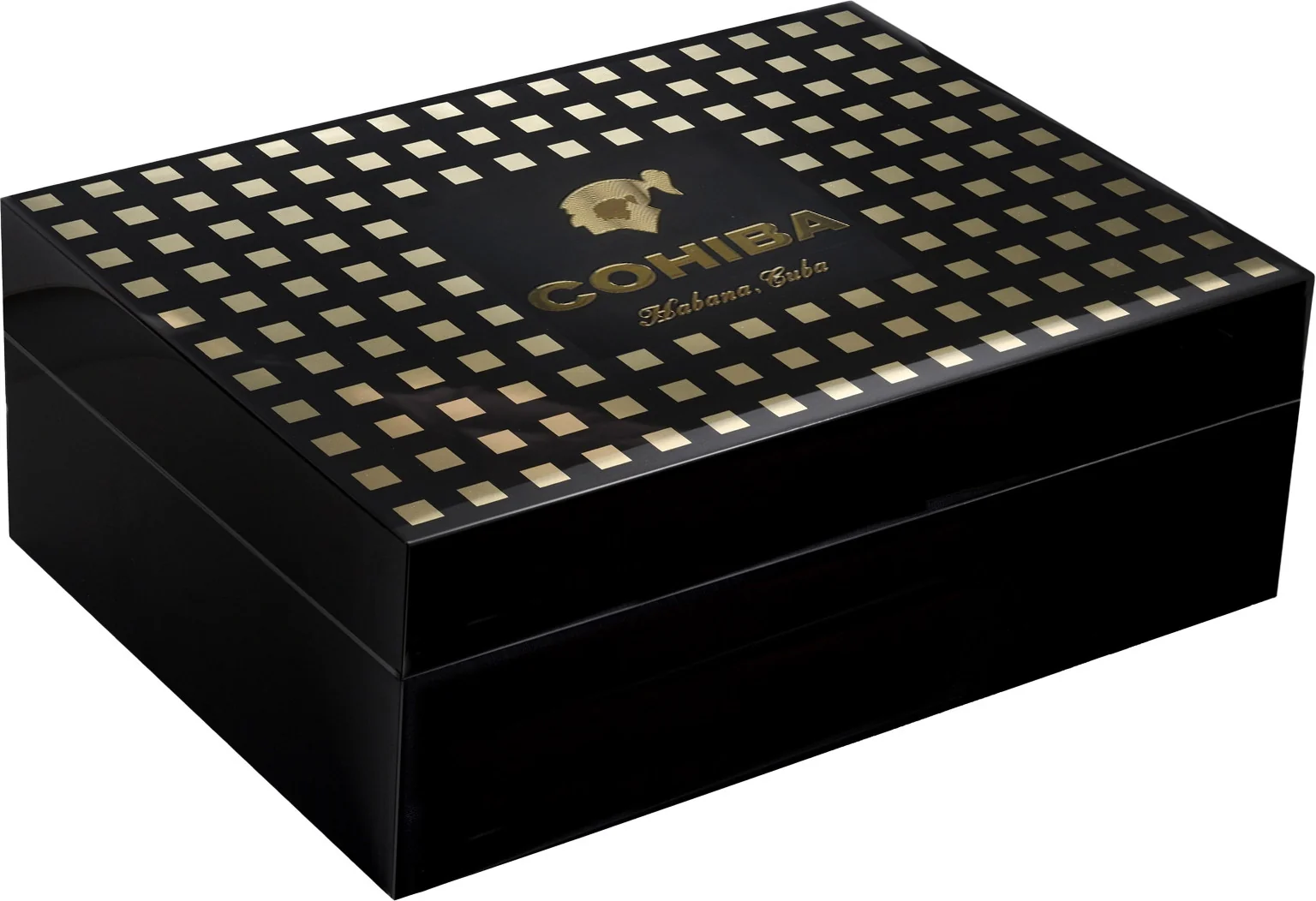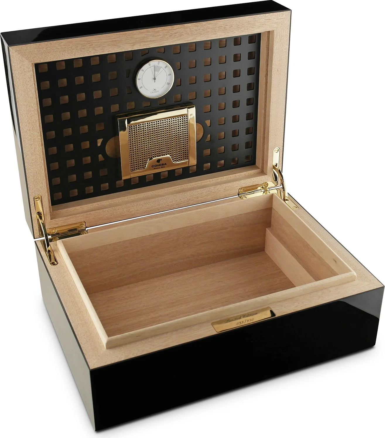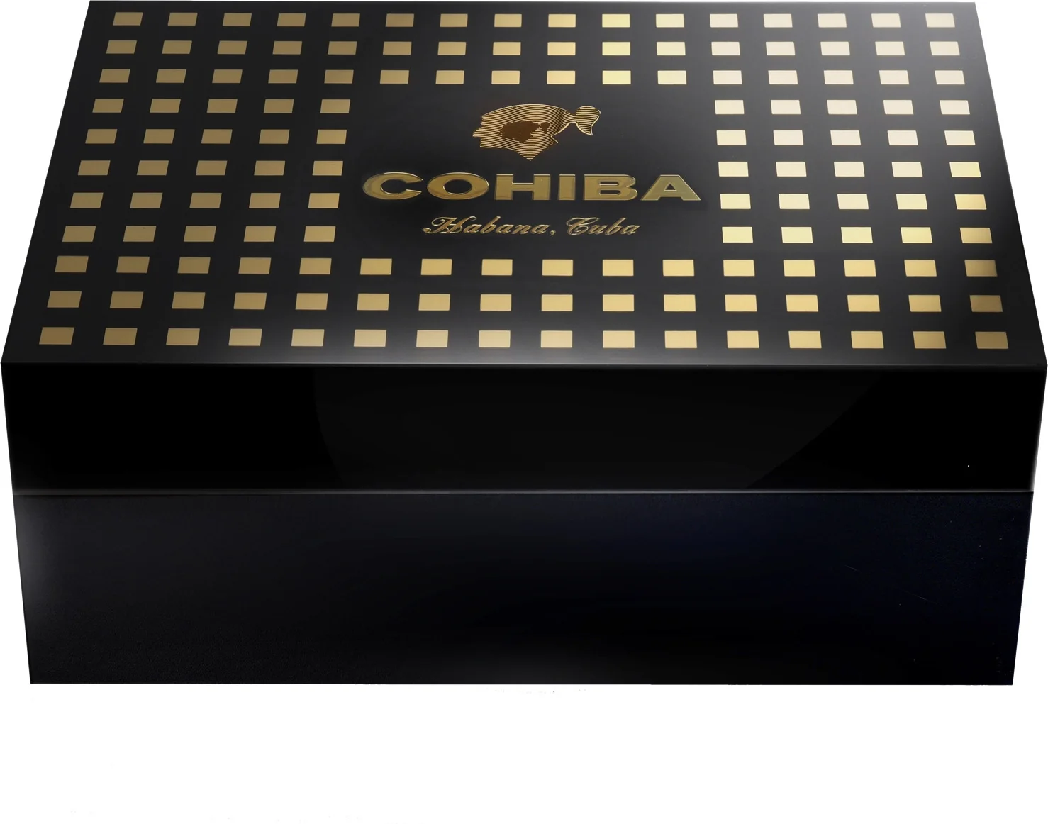 Humidoren har en högglansig svart finish som påminner om fin pianolack. Traditionella guldelement ger eleganta accenter. Den berömda Cohiba-logotypen visas tydligt på locket. Vid öppning avslöjas högkvalitativa guldgångjärn och en plakett som anger det individuella numret på den begränsade upplagan.