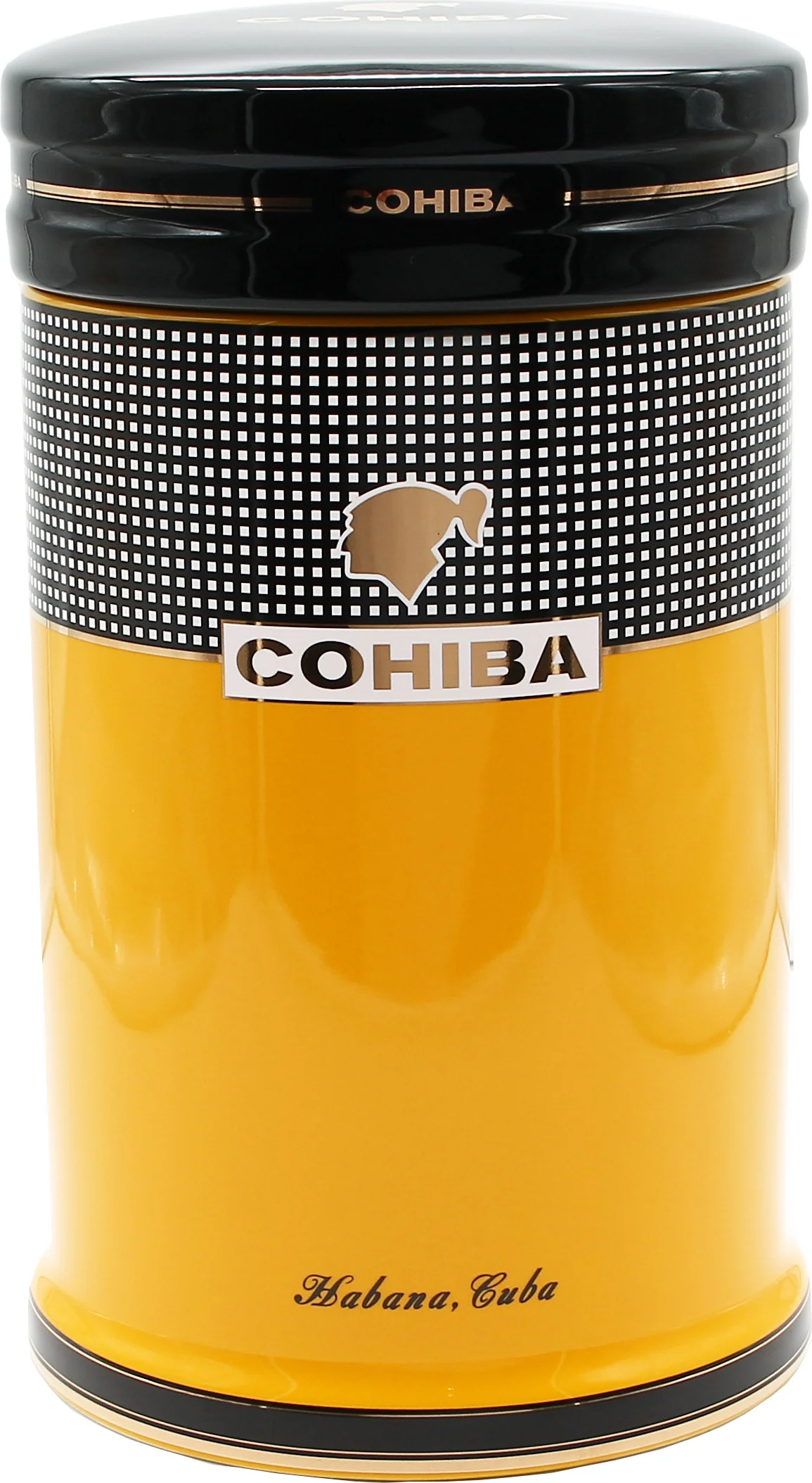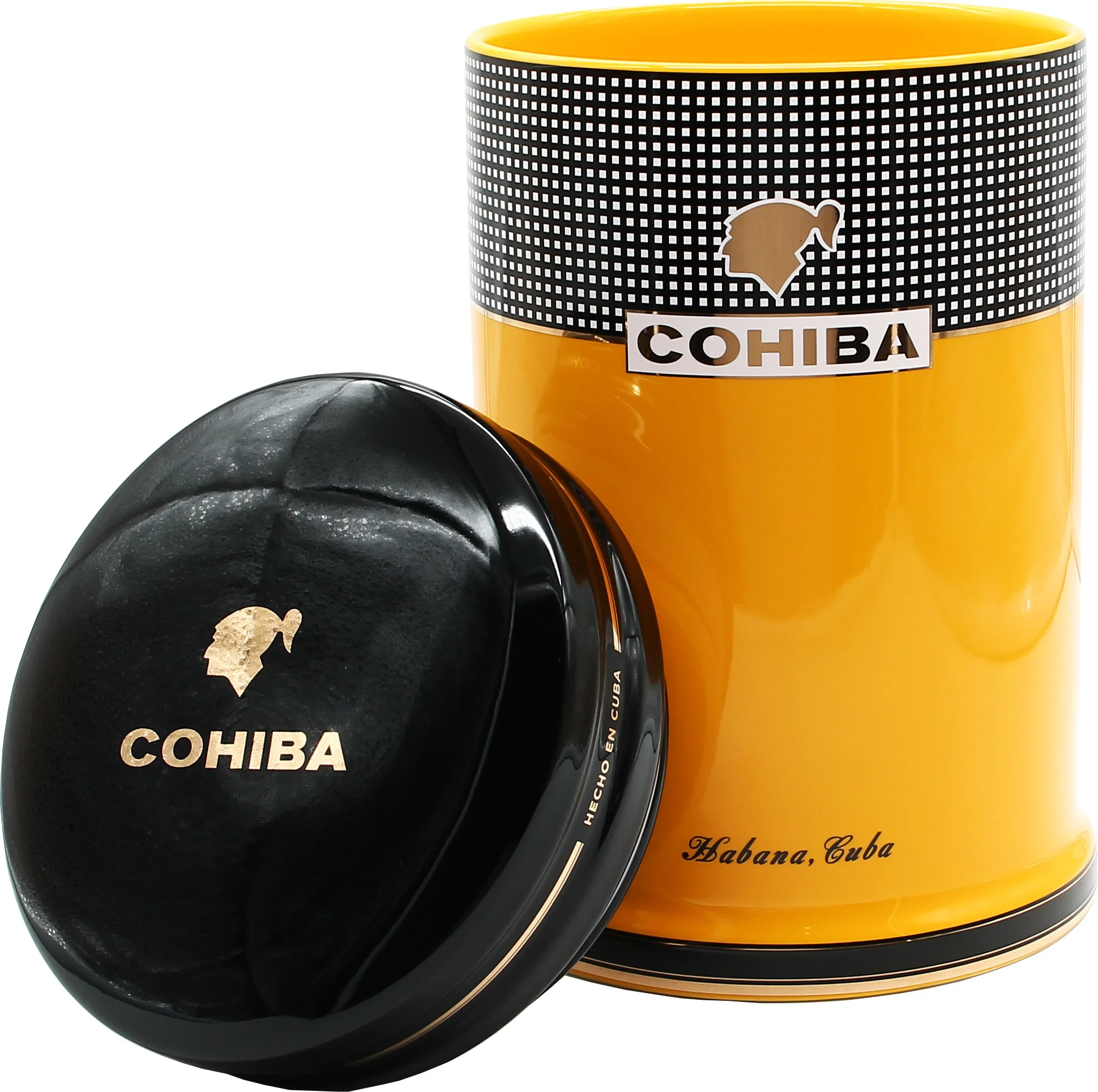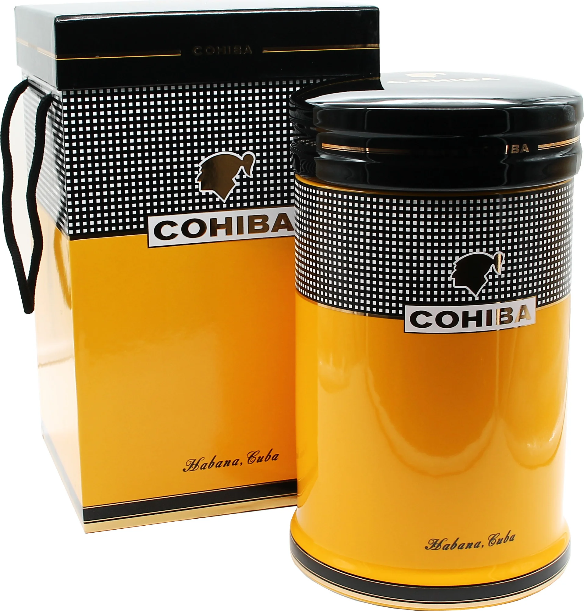 Cohiba Porcelain Jar är en funktionell och vackert designad förvaringsbehållare från det välkända kubanska cigarrmärket Cohiba. Den har varumärkets signaturfärger gult, svart och vitt, kompletterat med subtila guldaccenter. Samspelet mellan dessa element säkerställer ett tydligt erkännande av varumärkets stil utan att vara påträngande.