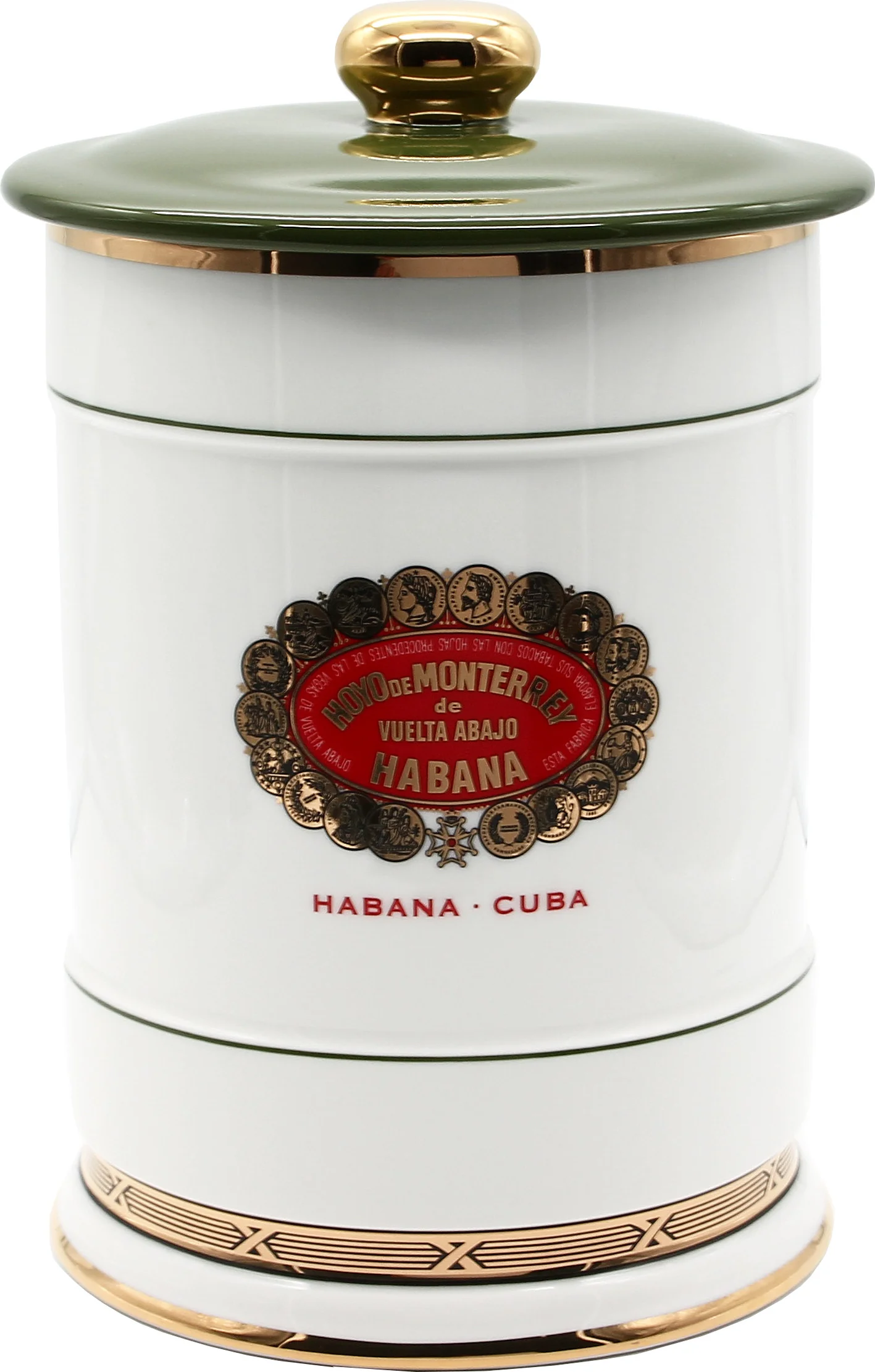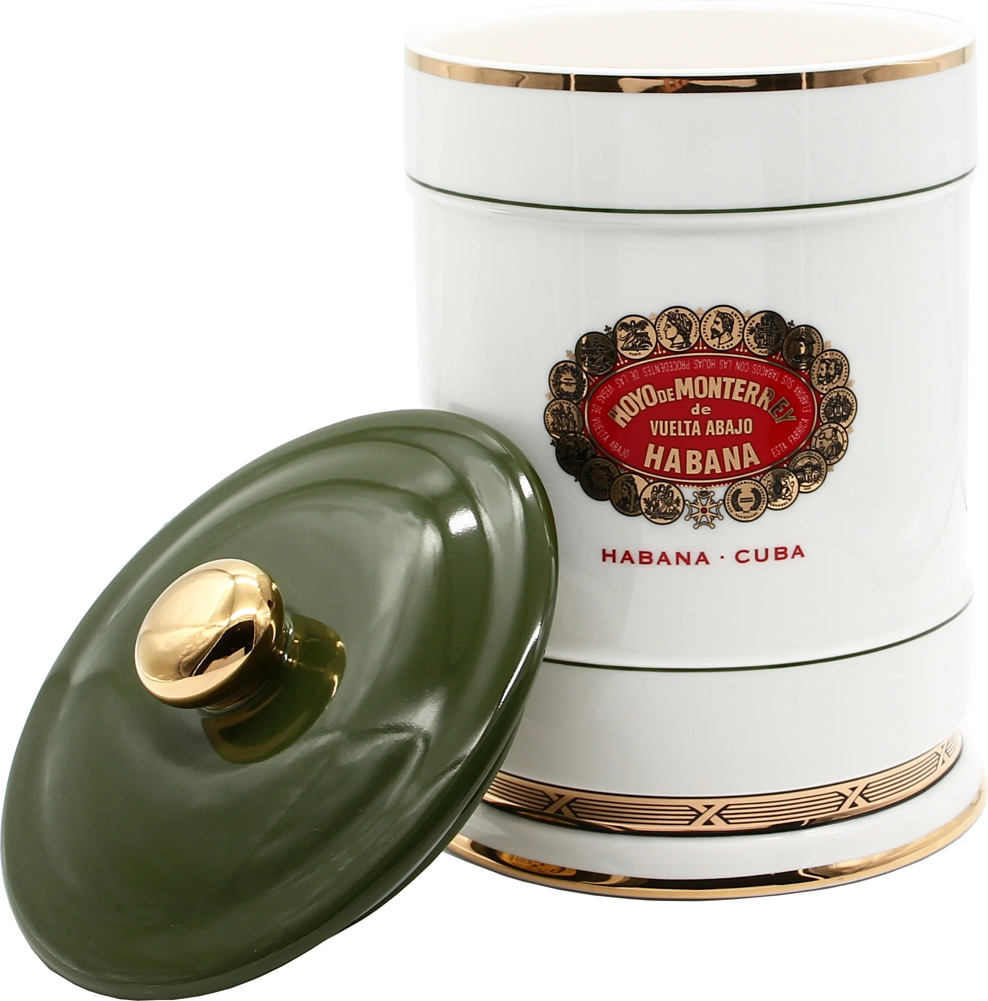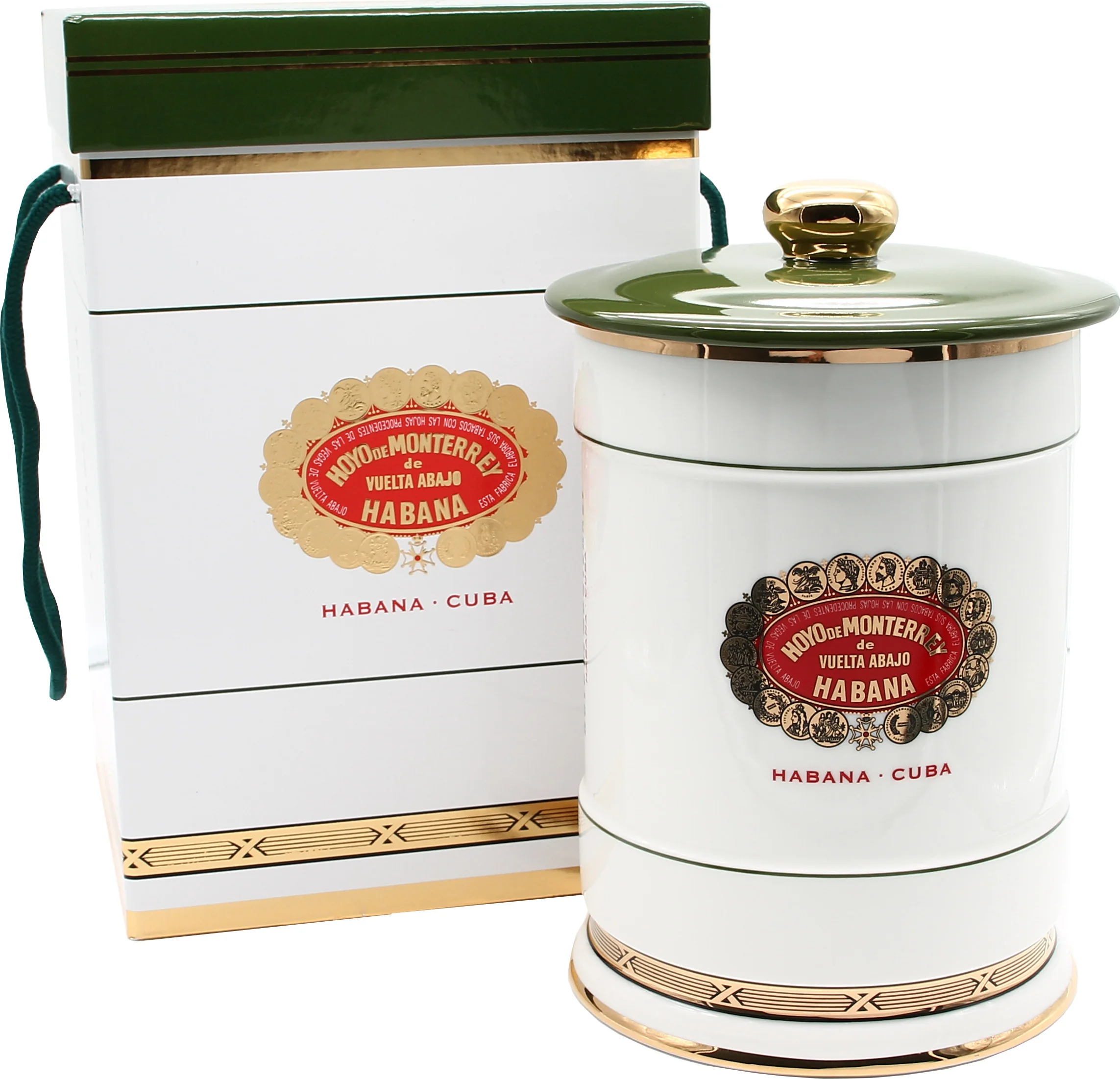 Hoyo de Monterrey Porcelain Jar är en funktionell förvaringsbehållare för cigarrer från det kubanska varumärket Hoyo de Monterrey. Den har vita, gröna och gyllene accenter, kompletterade med Hoyo de Monterrey-logotypen på framsidan, vilket säkerställer varumärkesigenkänning.