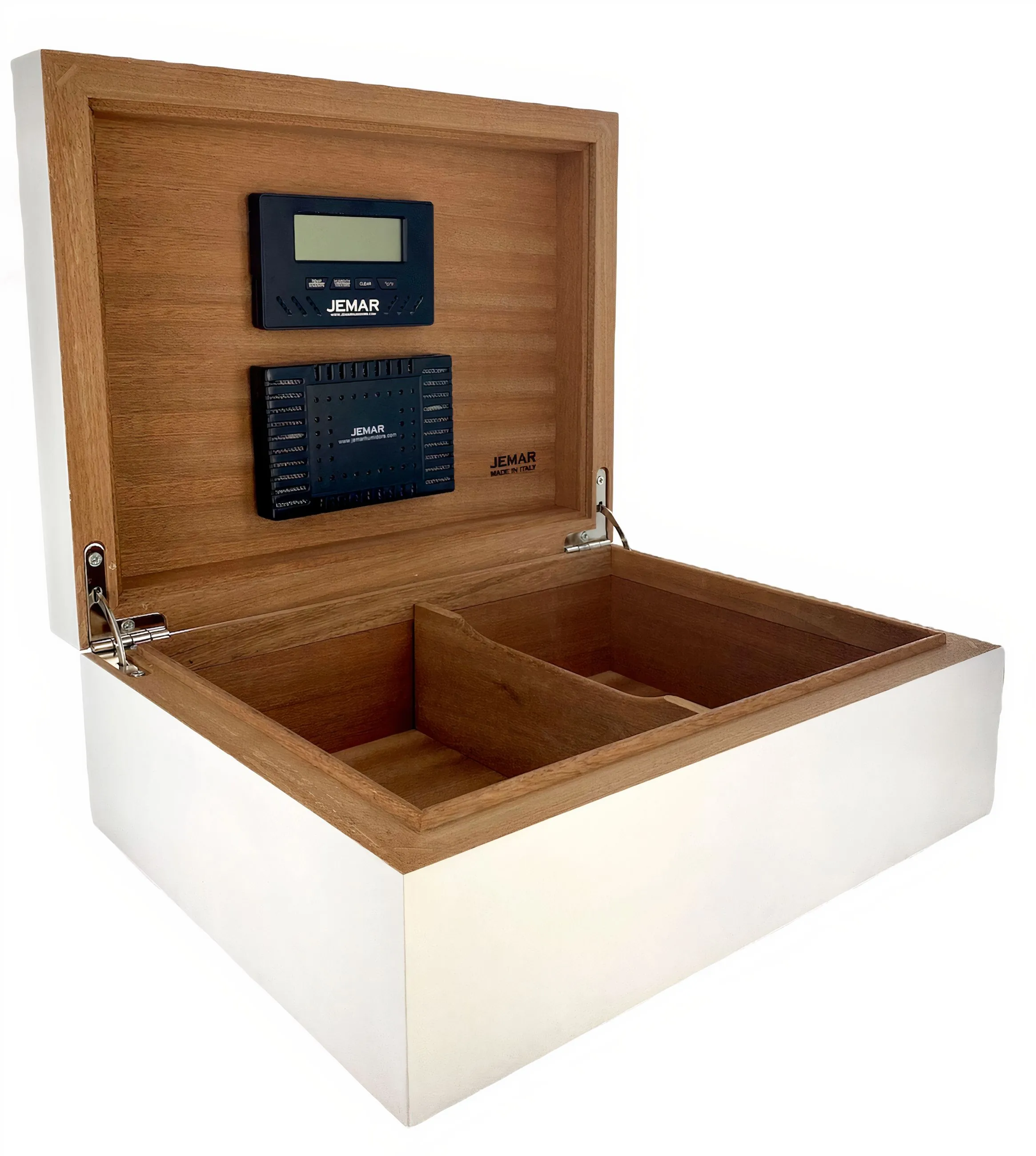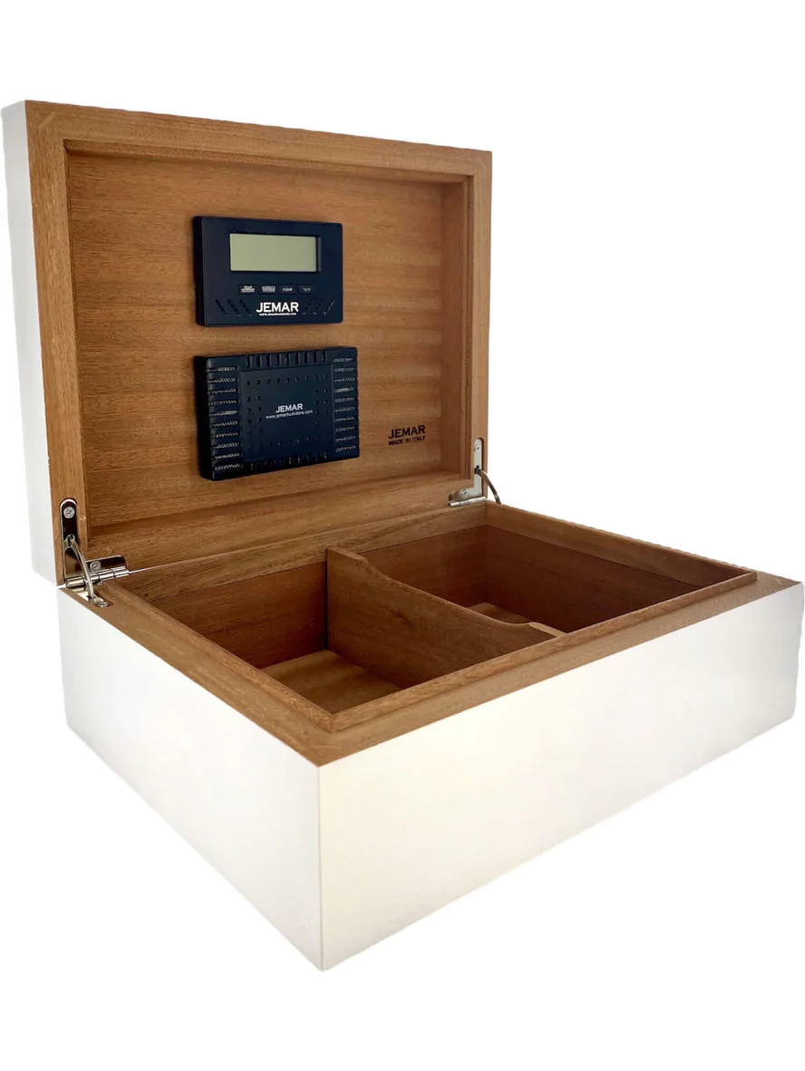 Der Jemar Humidor från **Rainbow Collection** är en elegant och modern förvaringslösning för cigarrer i snyggt vitt. Med sin blanka yta ger denna vita humidor estetiska detaljer och smälter harmoniskt in i alla miljöer.