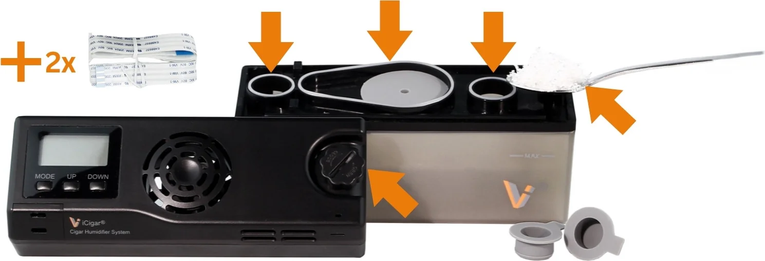 LV-underhållskit är det perfekta tillbehöret för att säkerställa felfri drift och lång livslängd för din elektroniska luftfuktare från LV. Den innehåller alla viktiga utbytes- och slitdelar som bör bytas ut regelbundet under användning för att bibehålla en konstant optimal luftfuktighet i din humidor.