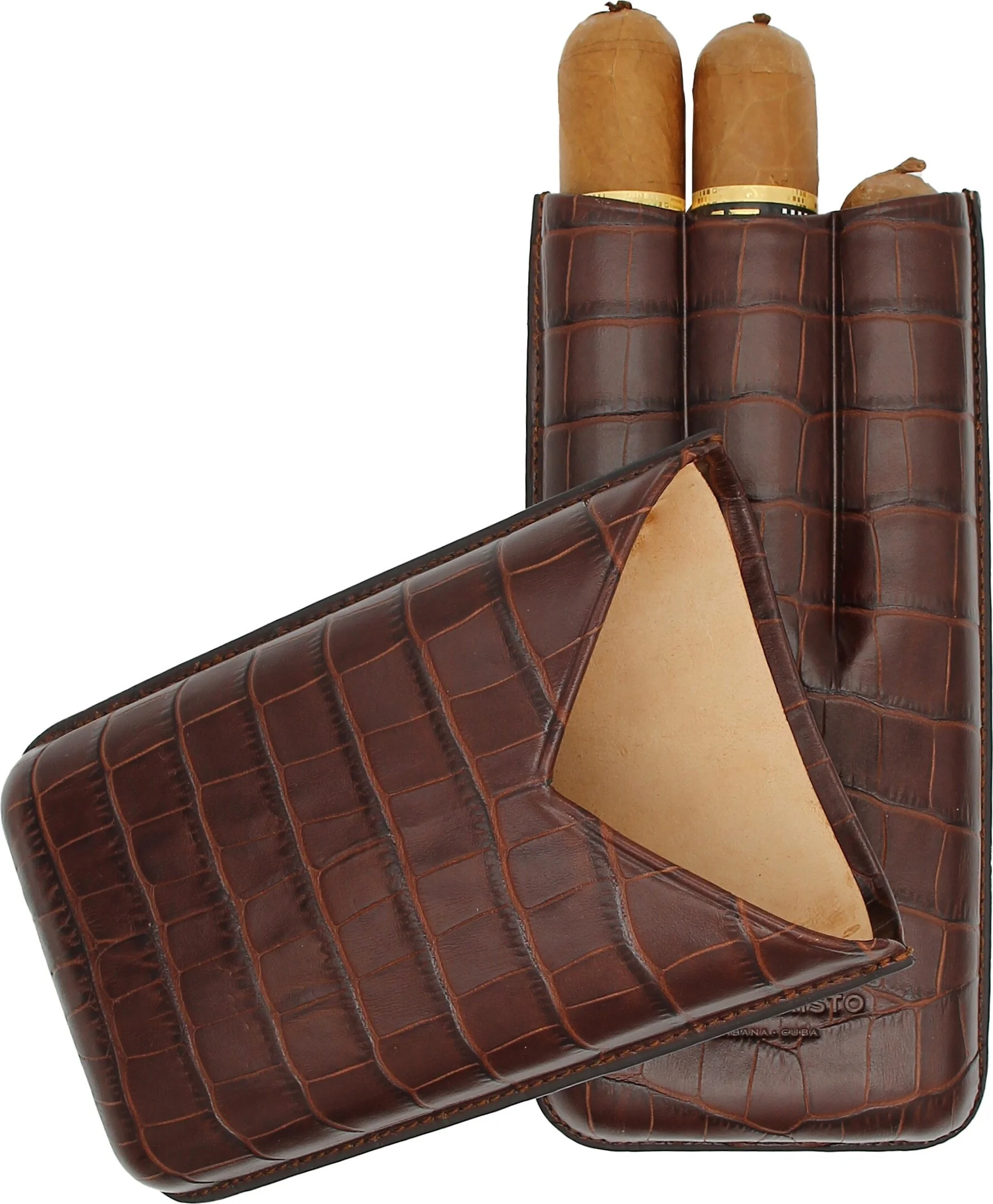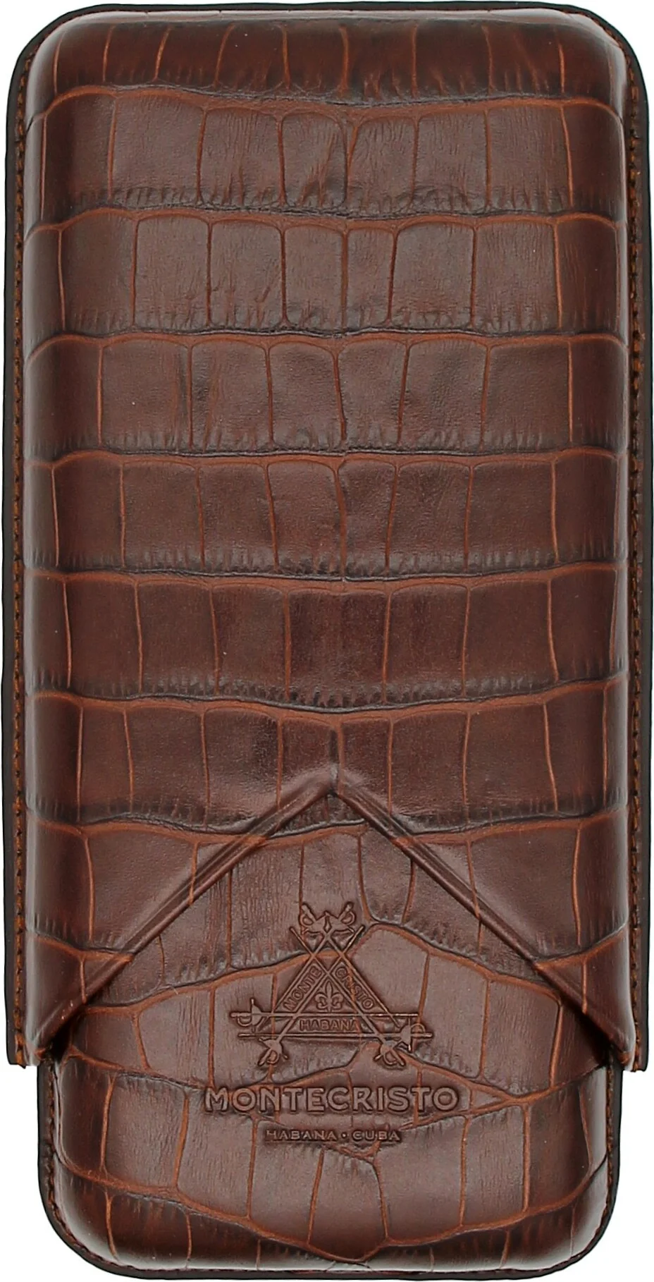 Montecristo cigarrfodral i tidlöst mörkbrunt är en lyxig accessoar från det kubanska cigarrmärket Montecristo. Den fint strukturerade läderytan med ett krokodilpräglat mönster förmedlar en autentisk, högkvalitativ känsla. Den präglade varumärkeslogotypen, som omisskännligt representerar Montecristo, pryder framsidan och ger fodralet ett exklusivt utseende.