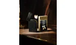 Kombinationen av mattsvart yta och guldfärgade accenter ger tändaren ett sofistikerat och modernt utseende. Den är påfyllningsbar, flamhöjden är justerbar och tändningen sker med utbytbar flinta.
