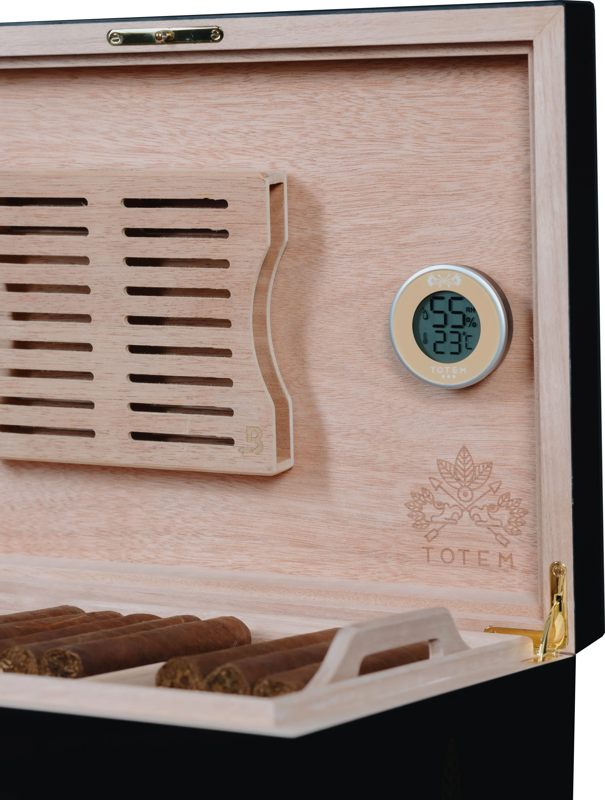 Den här digitala hygrotermometern kan fungera som en värdefull reservdel för ägare av Totem-humidorer eller kan installeras i humidorer från andra märken. Den visar aktuell relativ luftfuktighet och temperatur, vilket är viktiga indikatorer på klimatet i din humidor. Den runda formen och den platsbesparande designen gör att den passar in även i de minsta humidorerna utan att förlora volym. Den är tillverkad av metall och plast och drivs av ett CR2032 knappcellsbatteri som medföljer.