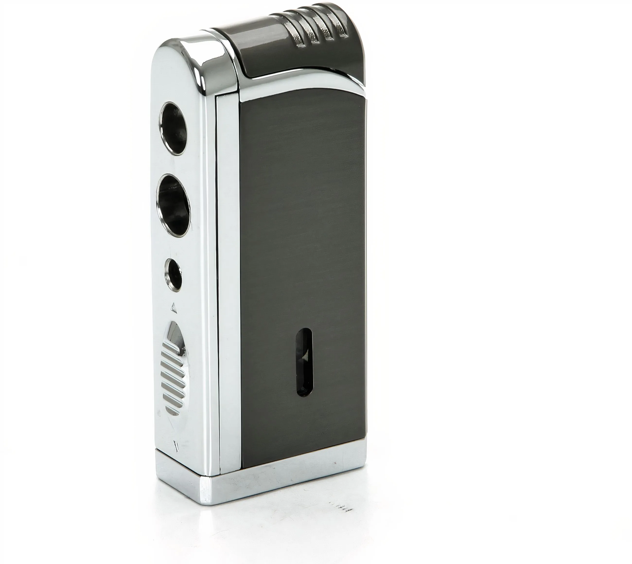 Tycoon Movie Jet III Cigarrtändare med Multi Punch Gunmetal effektiviserar cigarrrökning med större mångsidighet och en elegant tvåfärgad finish av gunmetal och krom. Den sofistikerade moderna looken är idealisk för den aktiva cigarrkännaren i stan.