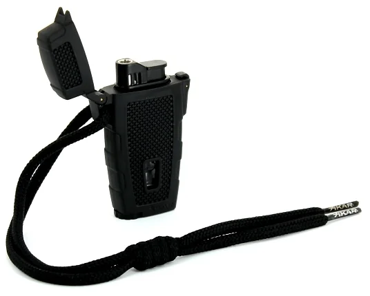 Xikar tändare modell Stratosphere i svart. Denna stormsäkra utomhuständare med turbolåga består av en gummikropp och har en lätt synlig nivåindikator.